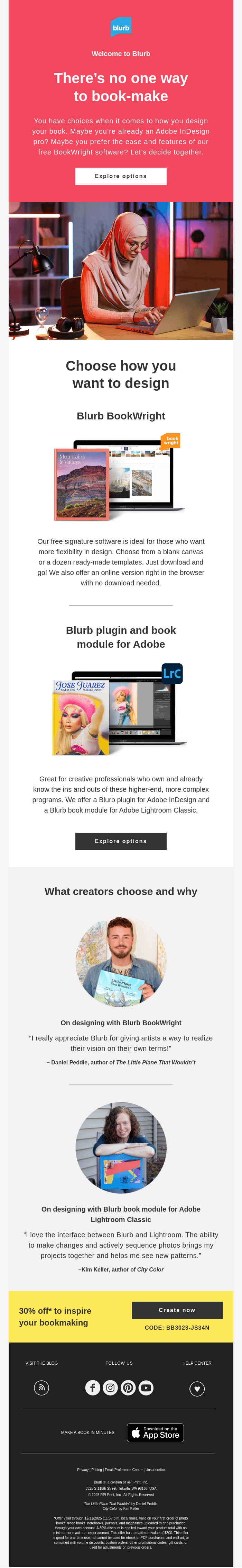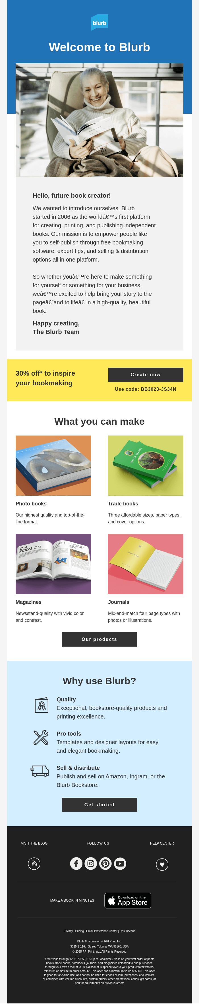 Blurb's welcome email showcases effective welcome design with clear messaging and strong visual hierarchy.