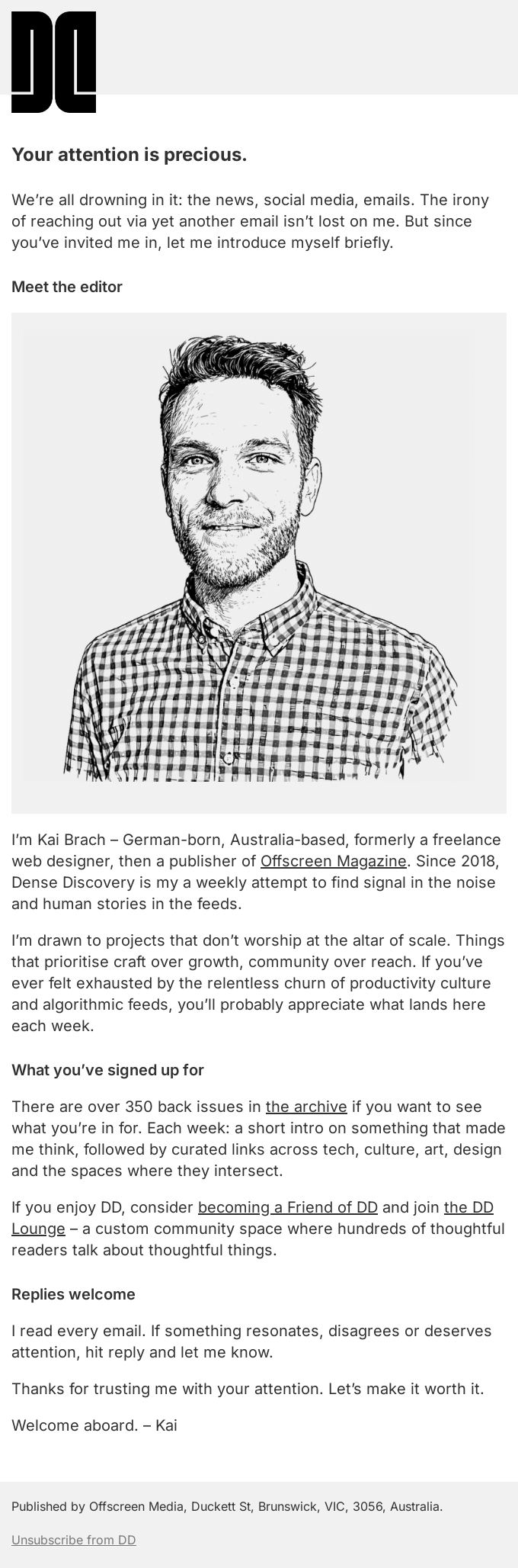 <p>Dense Discovery's welcome email introduces editor Kai Brach and his philosophy of finding signal in the noise through curated weekly content that prioritizes craft over growth and community over reach.</p>