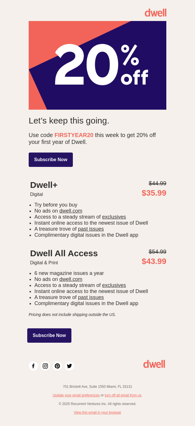 dwell's promotional discount email showcases effective promotional discount design with clear messaging and strong visual hierarchy.