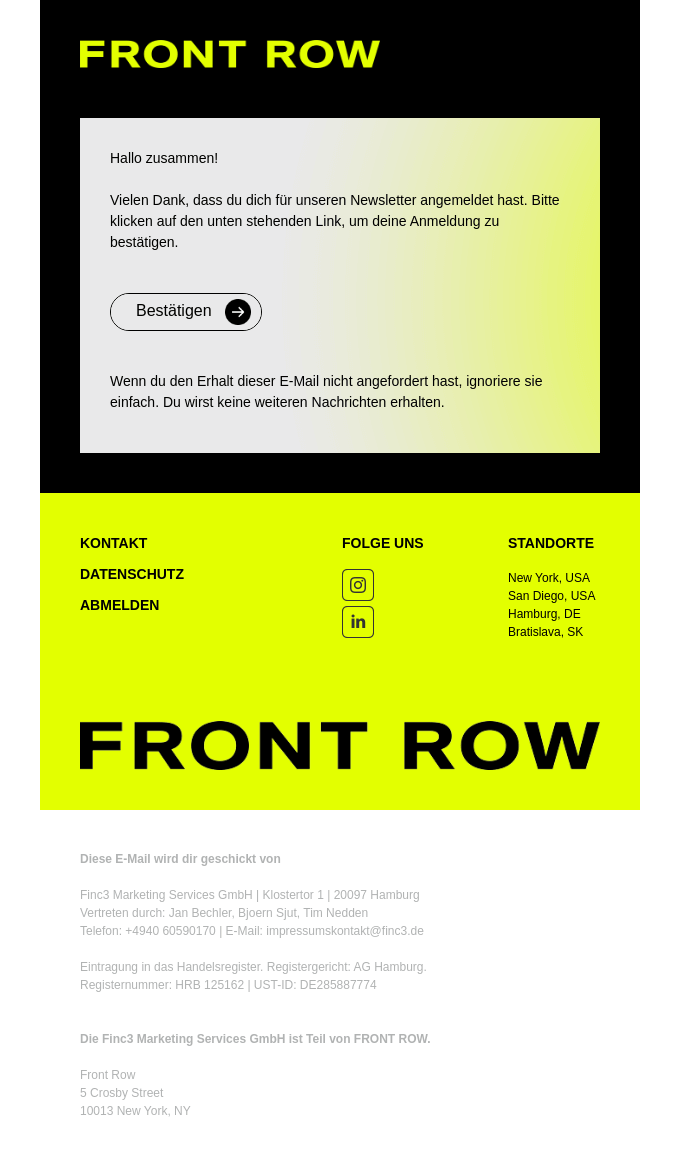 Front Row: Bitte bestätige deine Anmeldung zum Front Row Newsletter