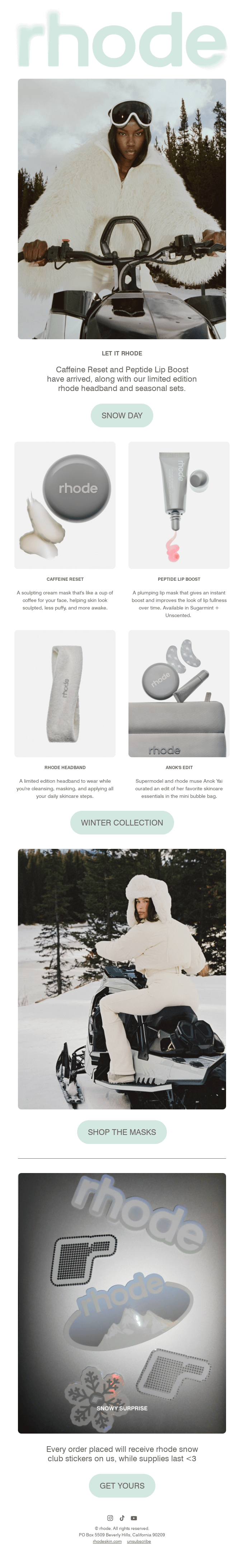 Rhode's seasonal email showcases effective seasonal design with clear messaging and strong visual hierarchy.