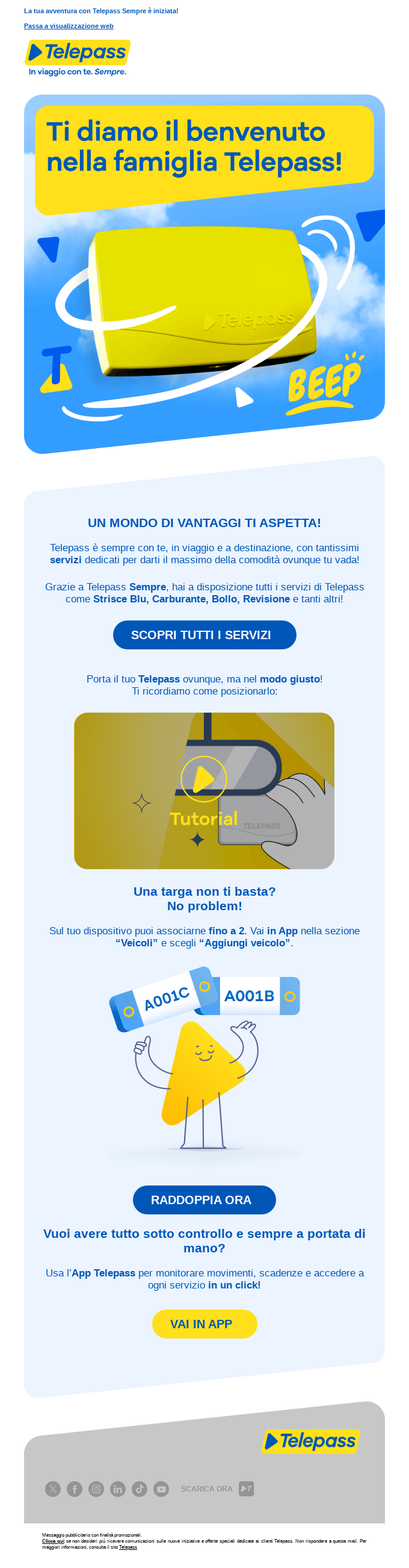 Telepass's welcome email showcases effective welcome design with clear messaging and strong visual hierarchy.