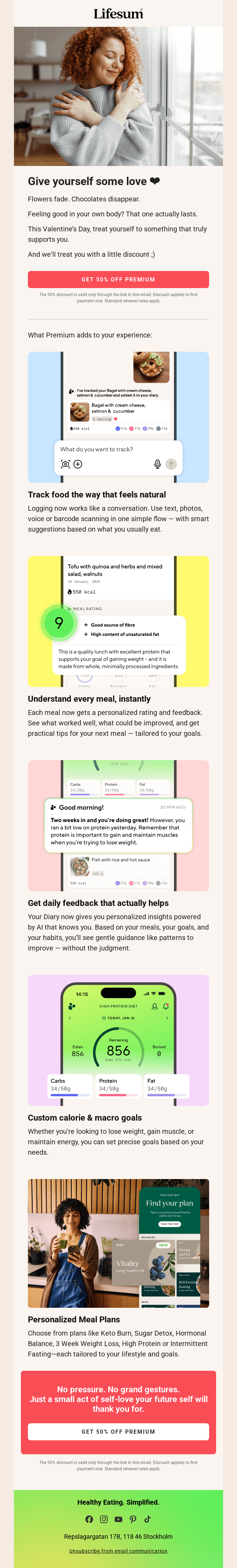 <p>Lifesum's Valentine's Day email promotes self-love and wellness over traditional gifts, offering a discount on their health and nutrition app with messaging focused on lasting body confidence versus temporary treats.</p>