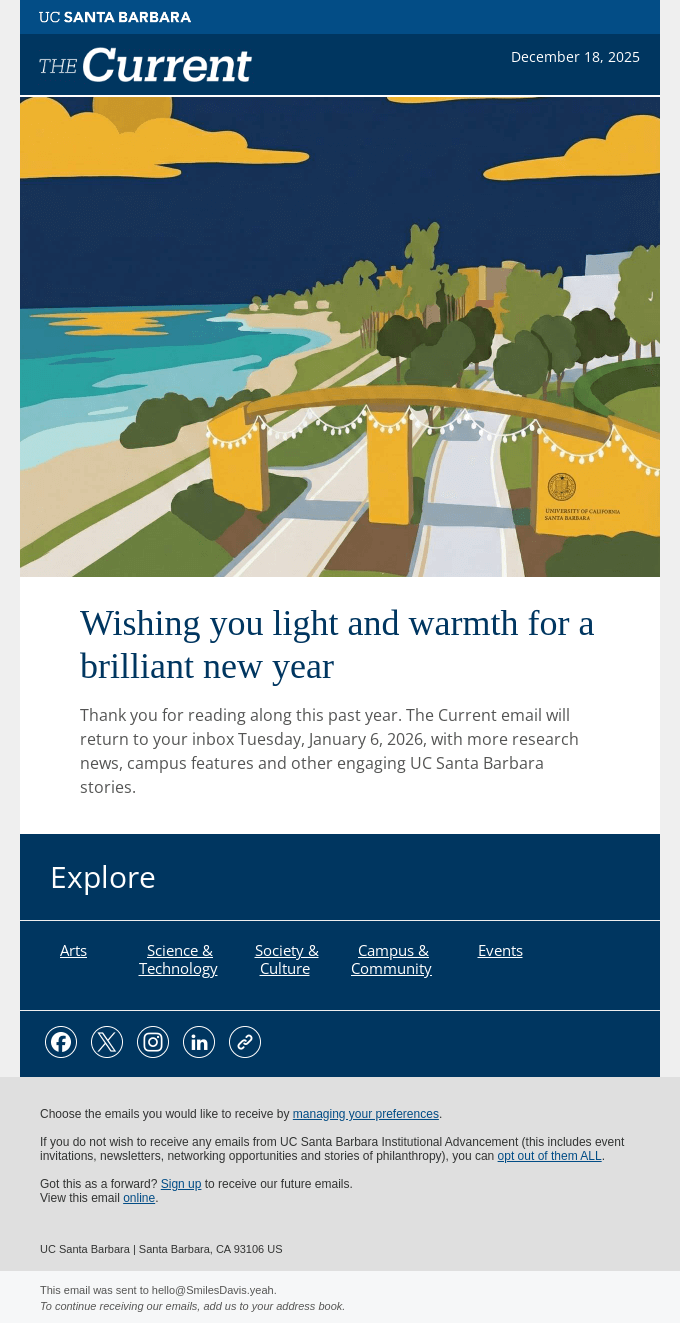 UC Santa Barbara's newsletter email showcases effective newsletter design with clear messaging and strong visual hierarchy.
