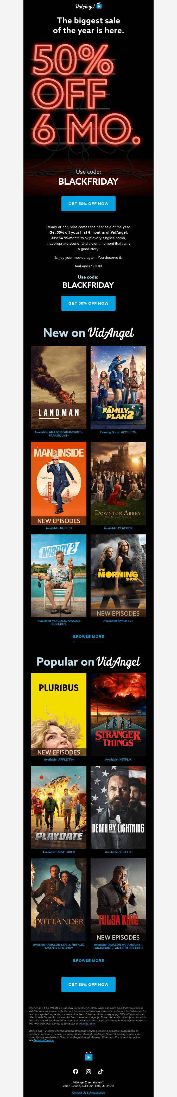 VidAngel's promotional discount email showcases effective promotional discount design with clear messaging and strong visual hierarchy.