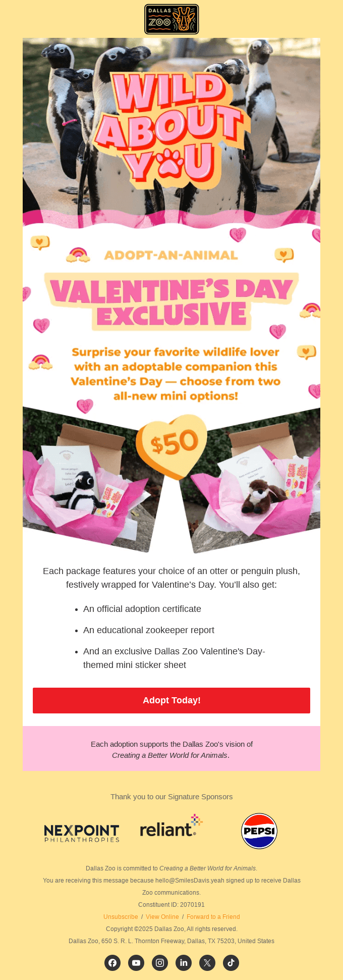 <p>Dallas Zoo promotes a Valentine's Day exclusive adopt-an-animal package featuring penguin or otter plush toys for $50, complete with adoption certificate and educational materials.</p>
