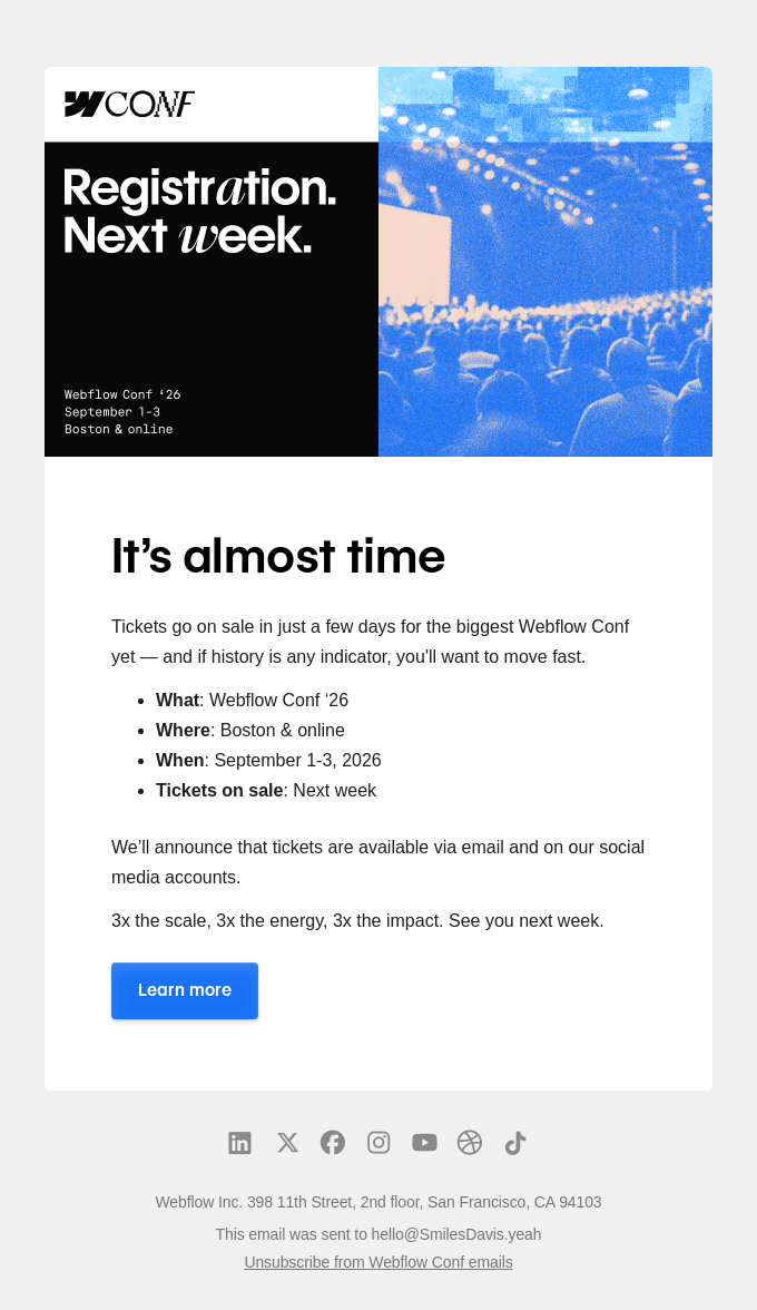 <p>A promotional email uses an interactive, app-like design to launch a new series. Frosted glass overlays and bold color blocking create visual depth while driving curiosity.</p>