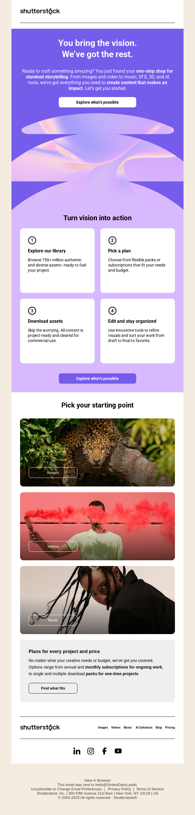 Shutterstock's welcome email showcases effective welcome design with clear messaging and strong visual hierarchy.