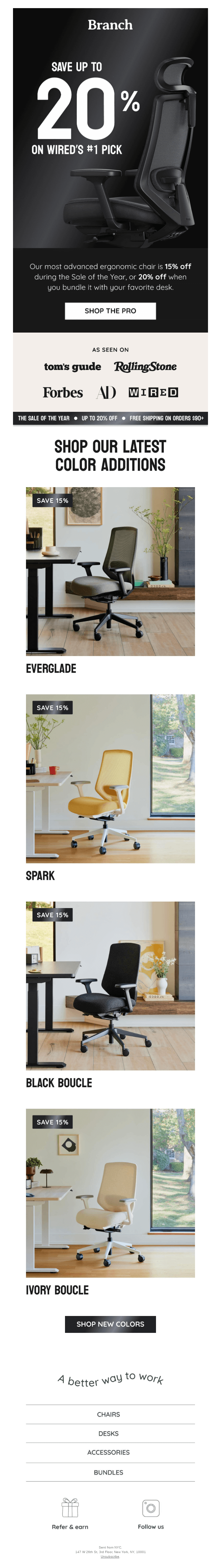 Branch's promotional discount email showcases effective promotional discount design with clear messaging and strong visual hierarchy.