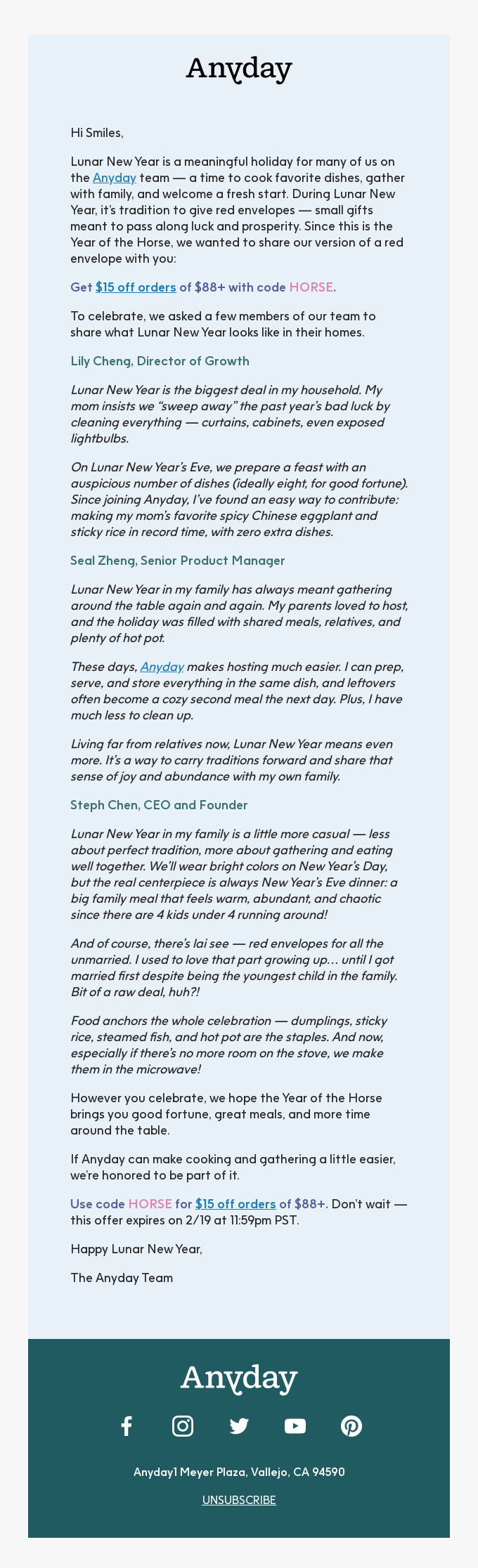 <p>Anyday celebrates Lunar New Year by offering customers a $15 discount as a digital 'red envelope' while sharing the cultural significance and team members' personal traditions.</p>