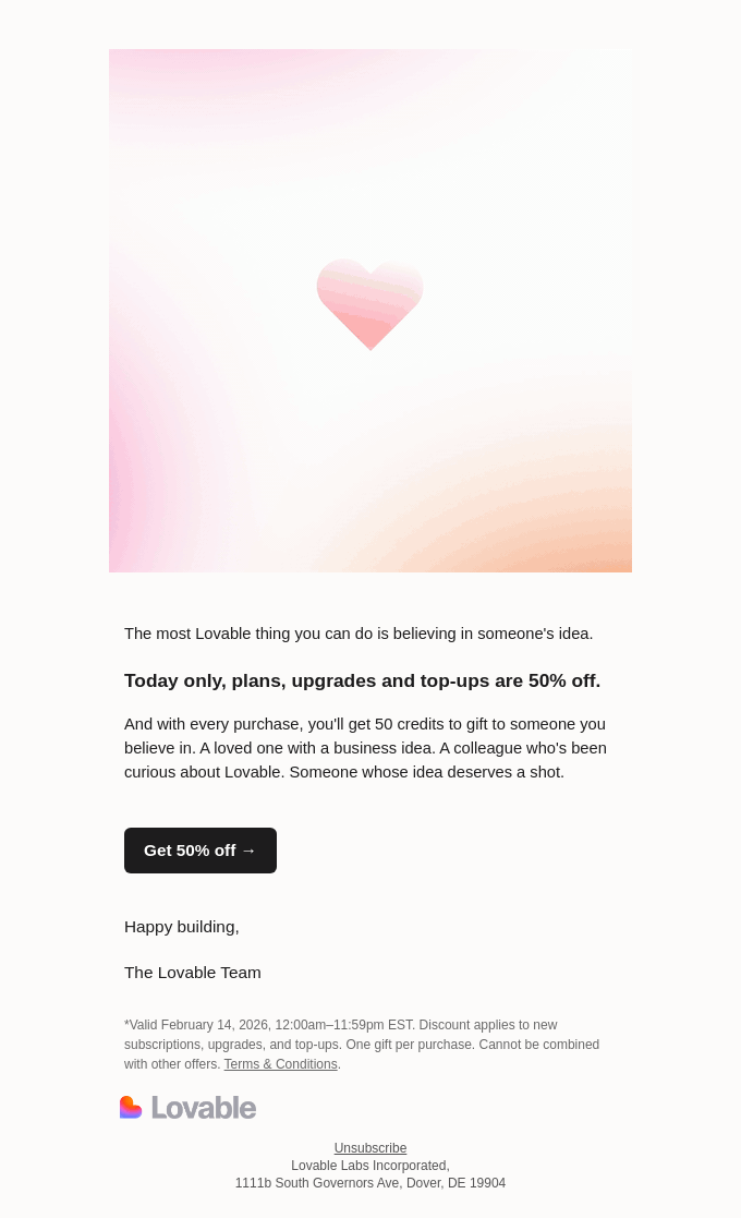 <p>Lovable celebrates Valentine's Day with a 50% off sale on all plans and upgrades, plus 50 free credits to gift to someone you believe in. The email features a beautiful gradient header design with heart motif and emphasizes supporting others' business ideas.</p>